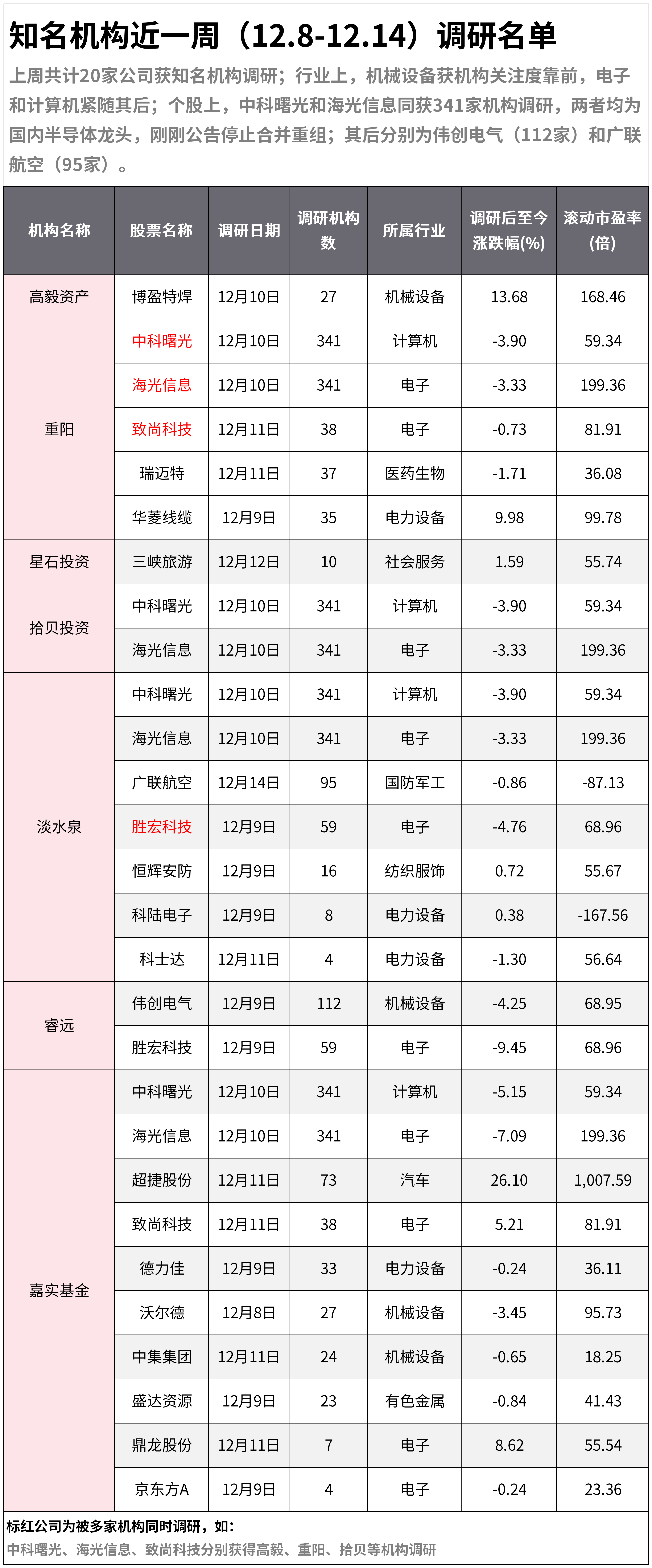 知名机构近一周(12.8-12.14)调研名单:机构扎堆两只半导体龙头