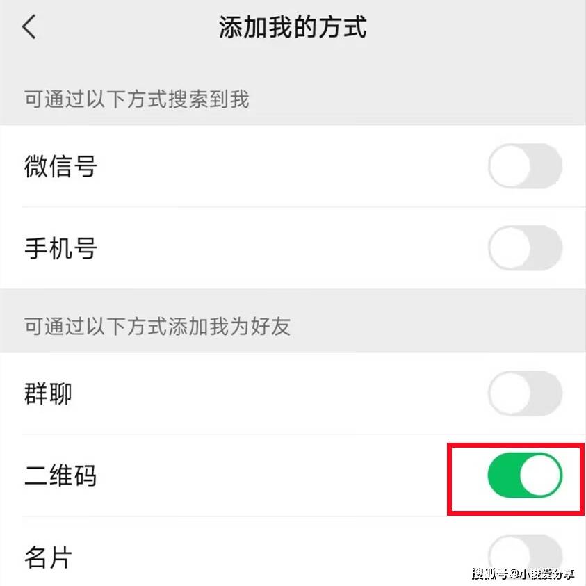 你点进来看一下,可以通过以下方式搜索到我,通过什么呢?微信号、手机号、QQ号、群聊、二维码名片等等,那些陌生人之所以能找到我们,就是通过群聊里的添加方式,或者呢通过我们之前泄露的手机号码来添加我们的,所以这个时候我们要干什么呢?把这些多余的添加方式都关掉,留一个二维码就行啊。这样呢,别人添加我们的时候啊,就只有通过扫描我们的二维码才能添加我们!