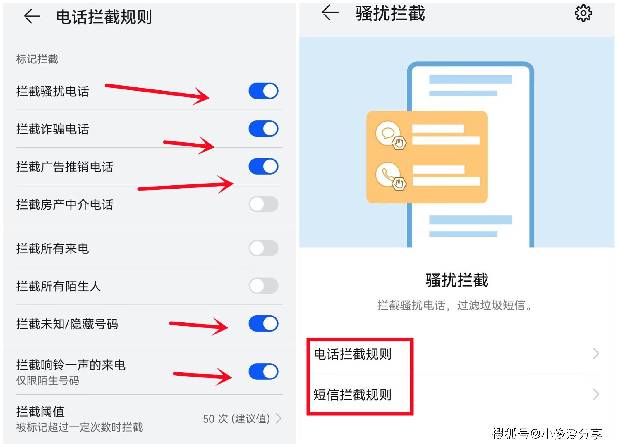 点开之后,下方有一个拦截规则,点开第二个电话拦截规则,把拦截骚扰电话,诈骗电话,广告推销,房产中介全部打开,但是如果说最近你要买房,租房,就不能关闭了,不然的话你接不到电话了,明白吧?好,这是第二个。