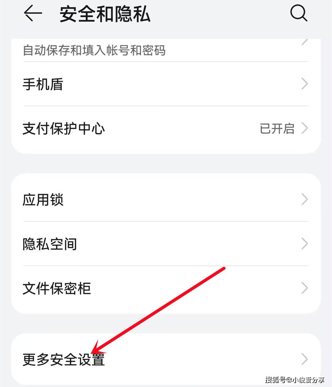 接着我们再返回,看第四个地方,打开手机上的设置,然后往下滑找到安全和隐私选项,点进来再往下滑,滑到最下面有一个更多安全设置。