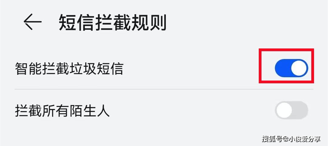 接着我们返回看看第三个,短信拦截规则,分别把智能拦截垃圾短信,这个给它打开,陌生短信这个就不要打开了。因为有些朋友啊换手机号,你知道它是就属于陌生类的,你要是打开了你就收不到了,对不对?打开这两个就可以了,这是第三个地方!