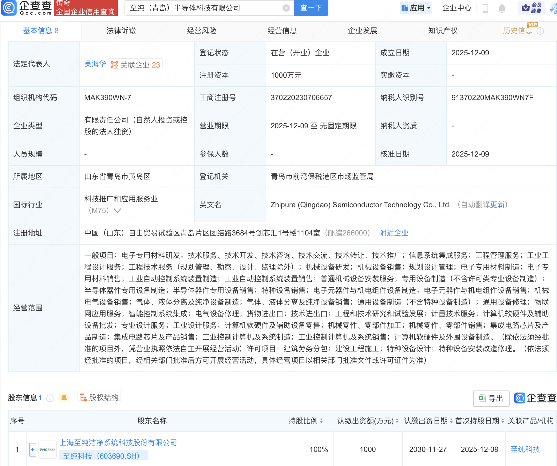 企查查APP显示,近日,至纯(青岛)半导体科技有限公司成立,经营范围包含:半导体器件专用设备制造;半导体器件专用设备销售;集成电路芯片及产品制造;集成电路芯片及产品销售等。企查查股权穿透显示,该公司由至纯科技(603690)全资持股。