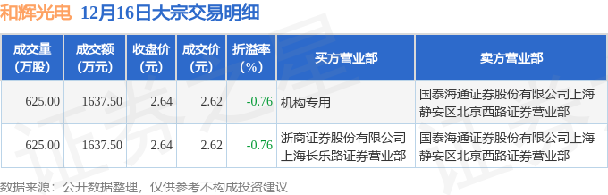 证券之星消息,12月16日和辉光电发生大宗交易,交易数据如下: