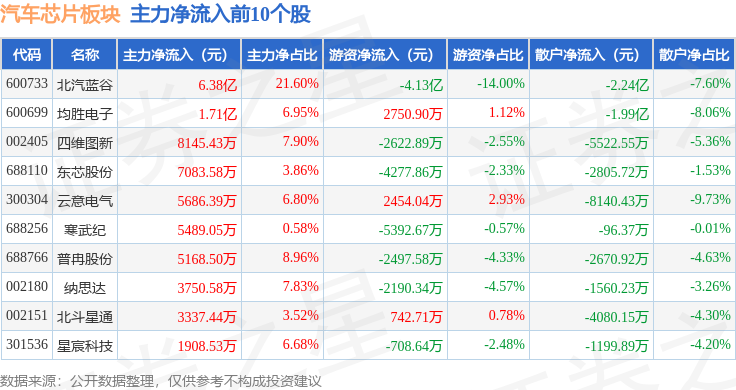从资金流向上来看,当日汽车芯片板块主力资金净流出32.22亿元,游资资金净流入1.38亿元,散户资金净流入30.84亿元。汽车芯片板块个股资金流向见下表: