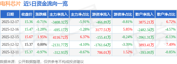 证券之星消息,截至2025年12月17日收盘,电科芯片(600877)报收于15.36元,下跌0.71%,换手率3.2%,成交量37.89万手,成交额5.76亿元。
