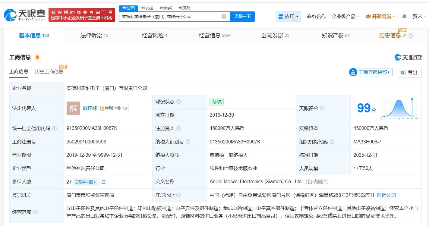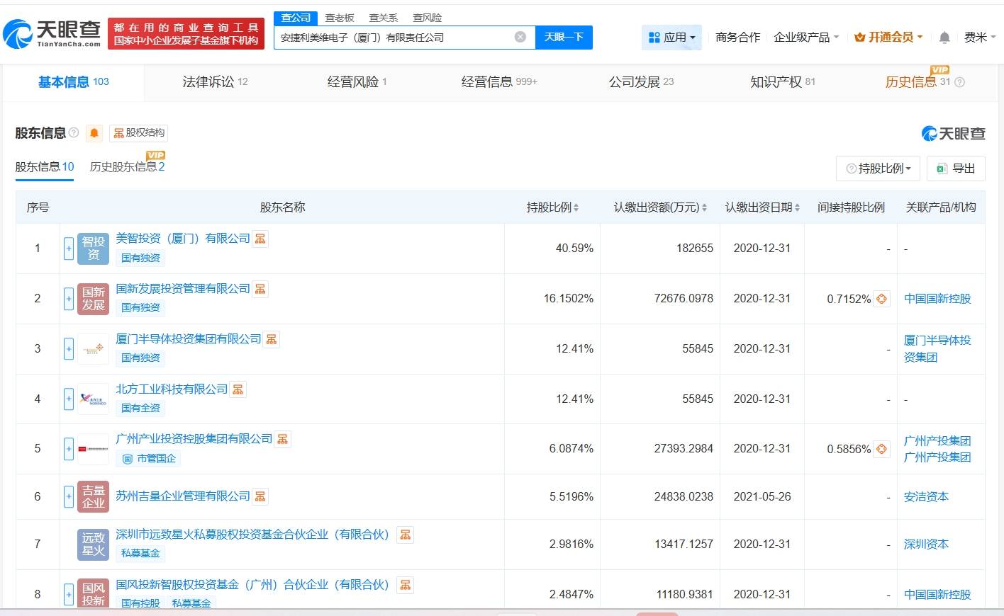 该公司成立于2019年12月,法定代表人为熊正峰,注册资本45亿人民币,经营范围包括光电子器件及其他电子器件制造、印制电路板制造、电子元件及组件制造、集成电路制造等,现由美智投资(厦门)有限公司、厦门半导体投资集团有限公司及上述新增股东等共同持股。官网显示,该公司提供高度可靠且先进的HDI一站式解决方案。
