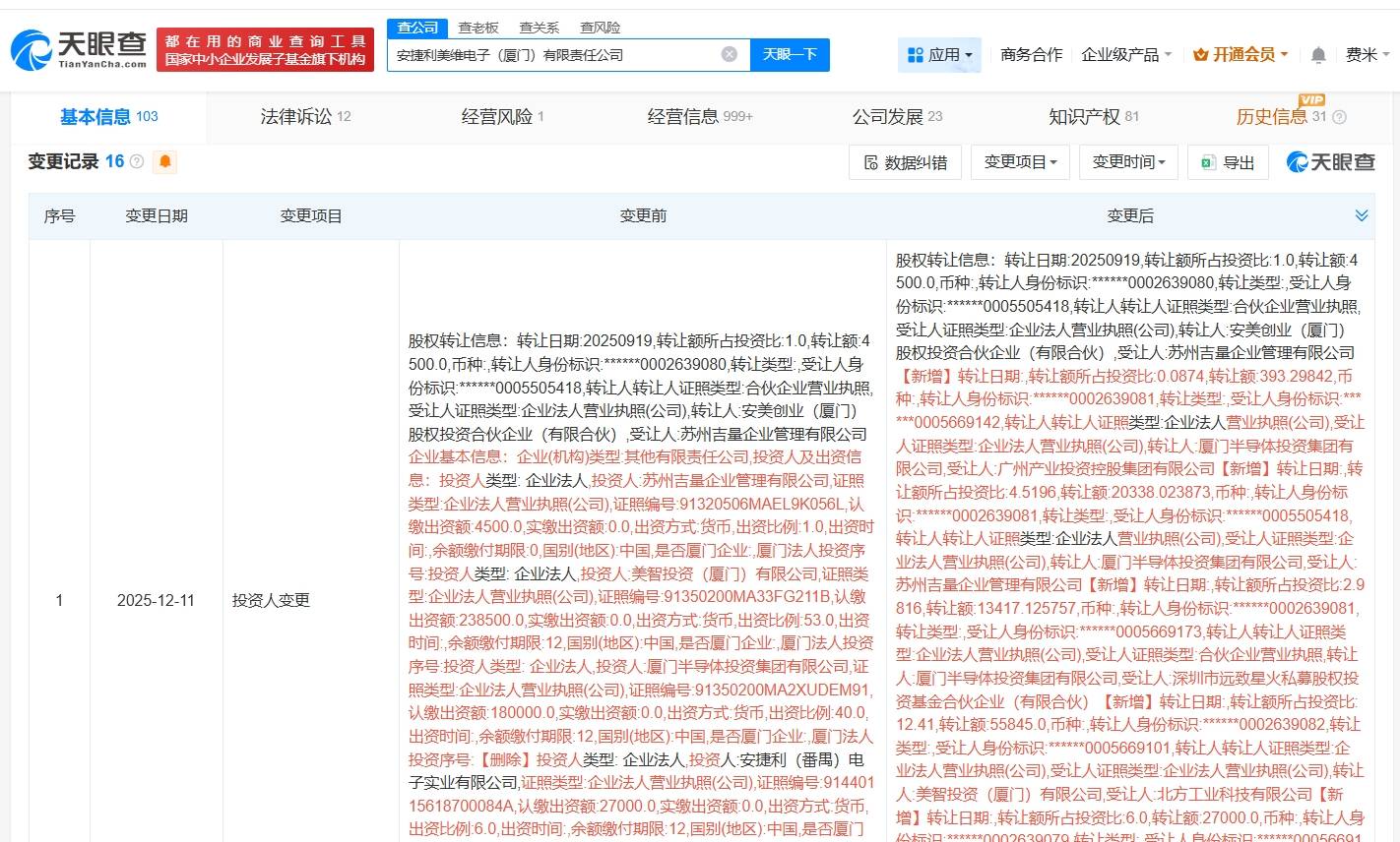 天眼查App显示,近日,安捷利美维电子(厦门)有限责任公司发生工商变更,原股东安捷利(番禺)电子实业有限公司退出,新增国家大基金三期旗下国投集新(北京)股权投资基金(有限合伙)、国新发展投资管理有限公司、广州产业投资控股集团有限公司等为股东。