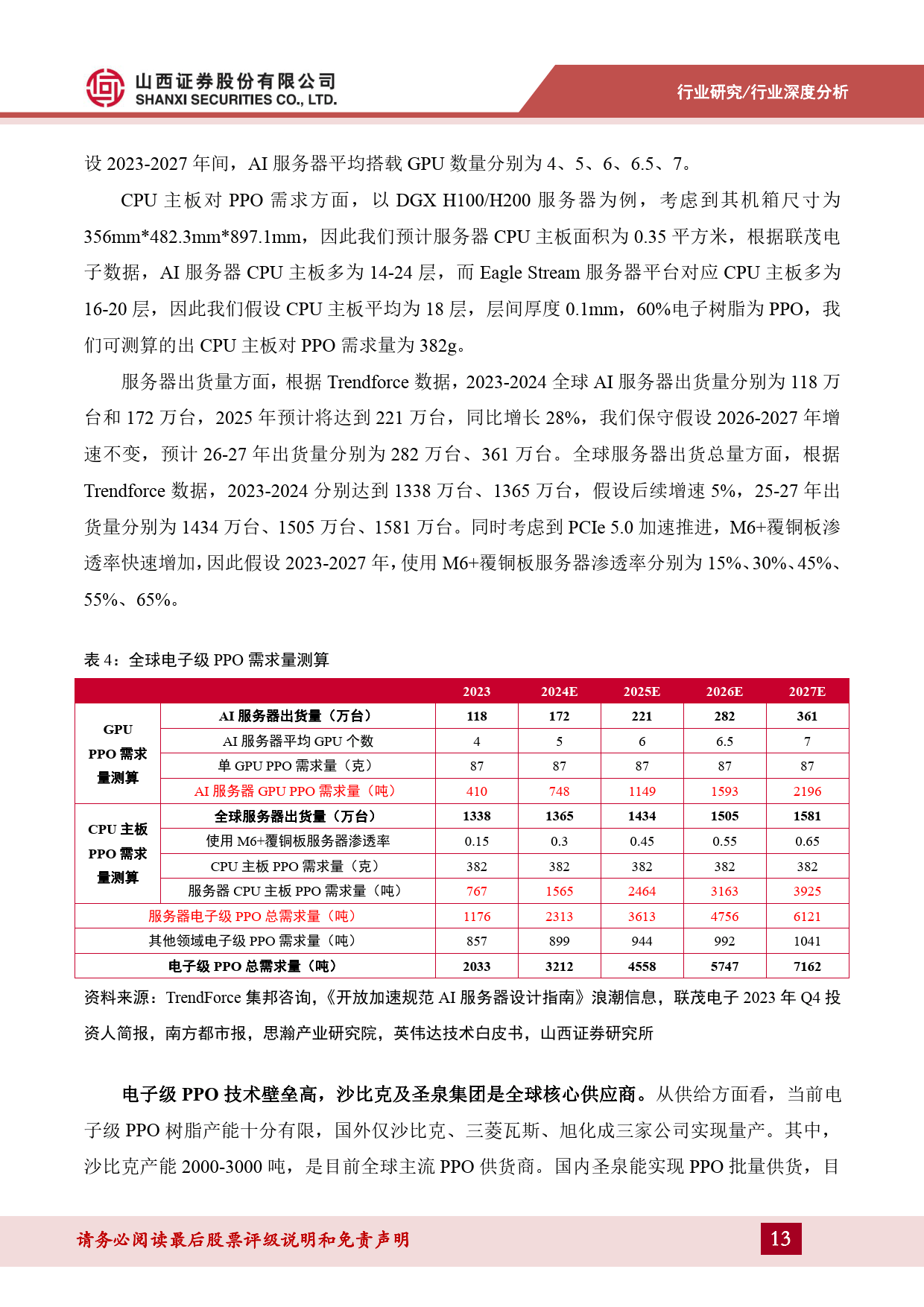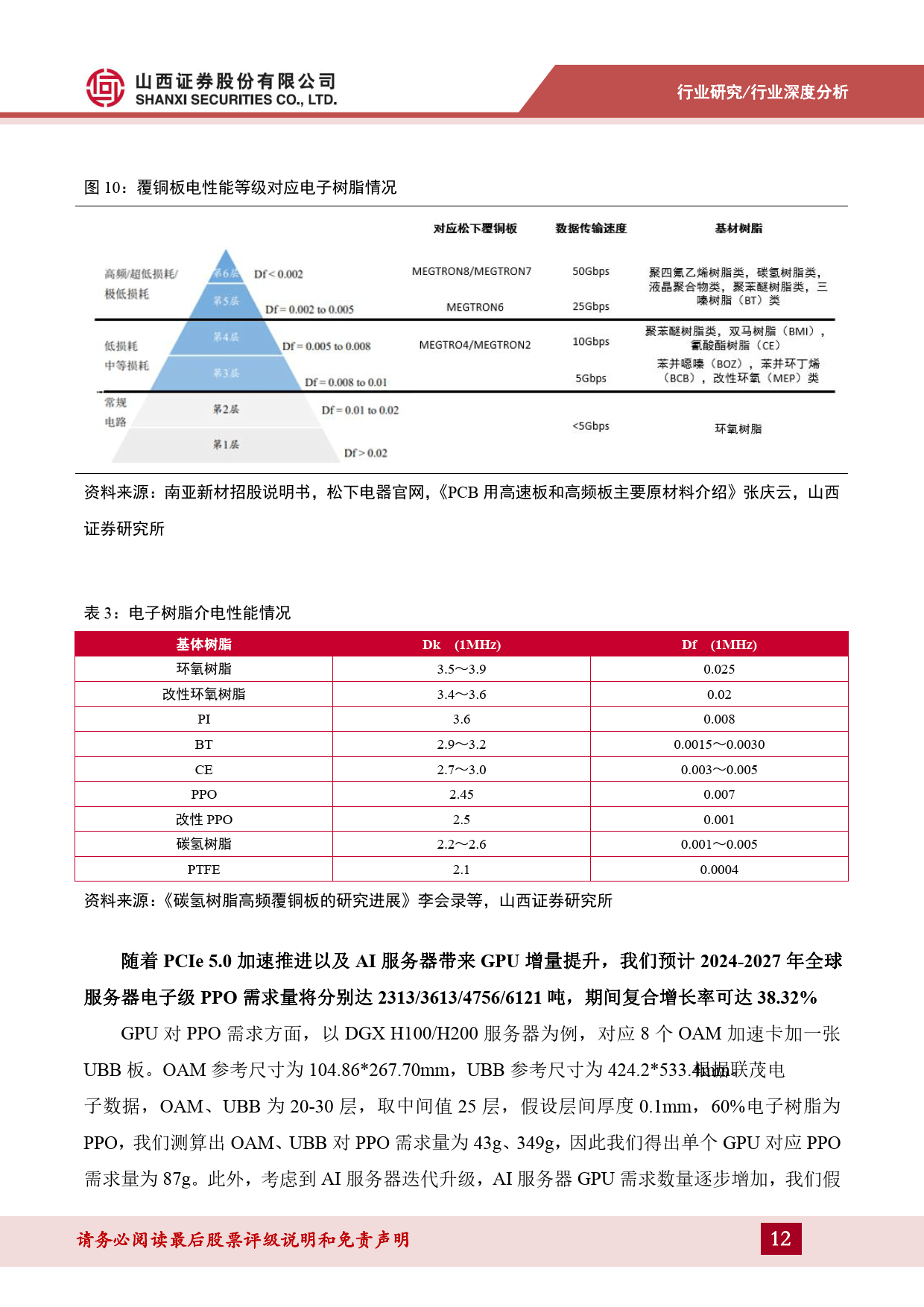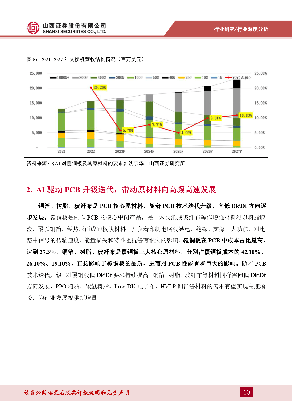 报告围绕AI服务器发展对PCB材料行业的驱动作用展开分析,核心聚焦PCB材料向高频高速升级的趋势及相关投资机会,要点如下:
