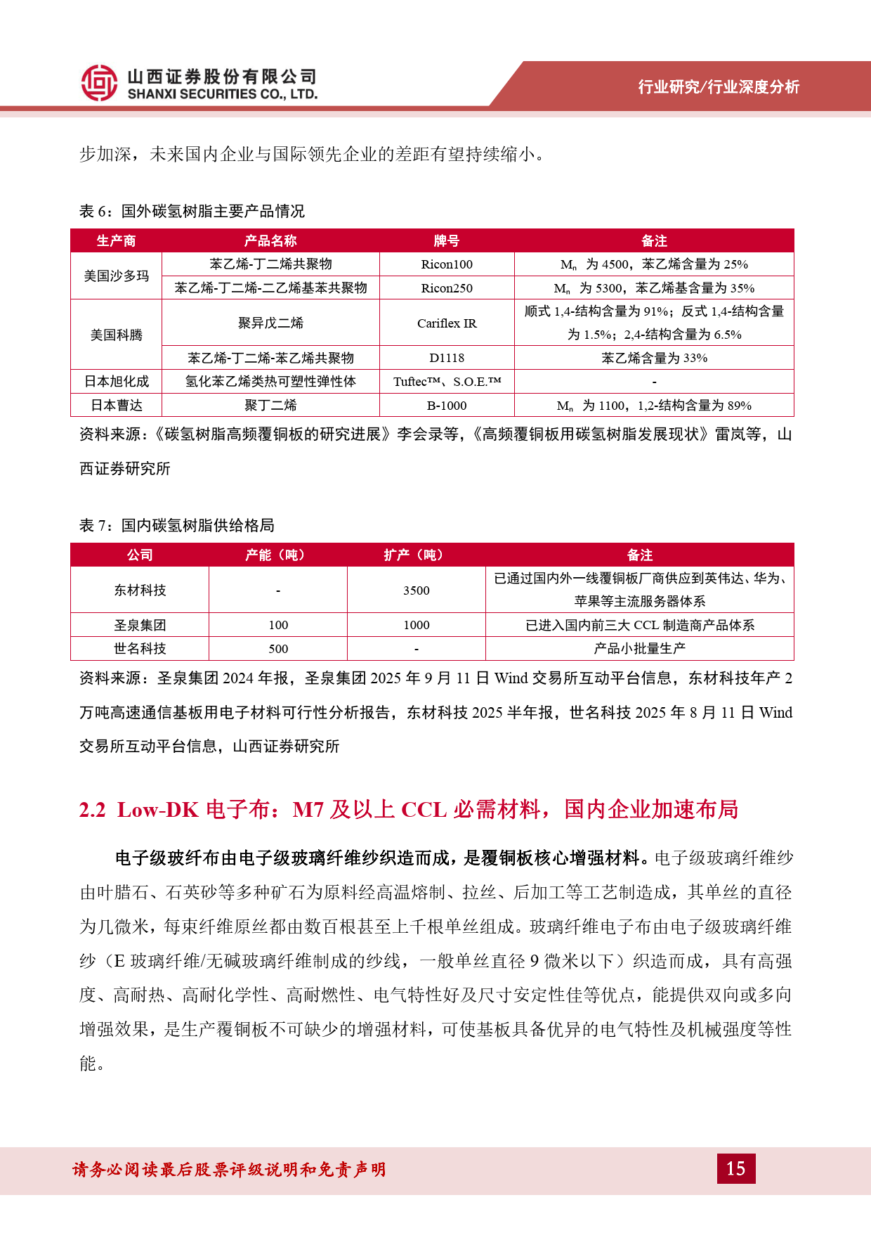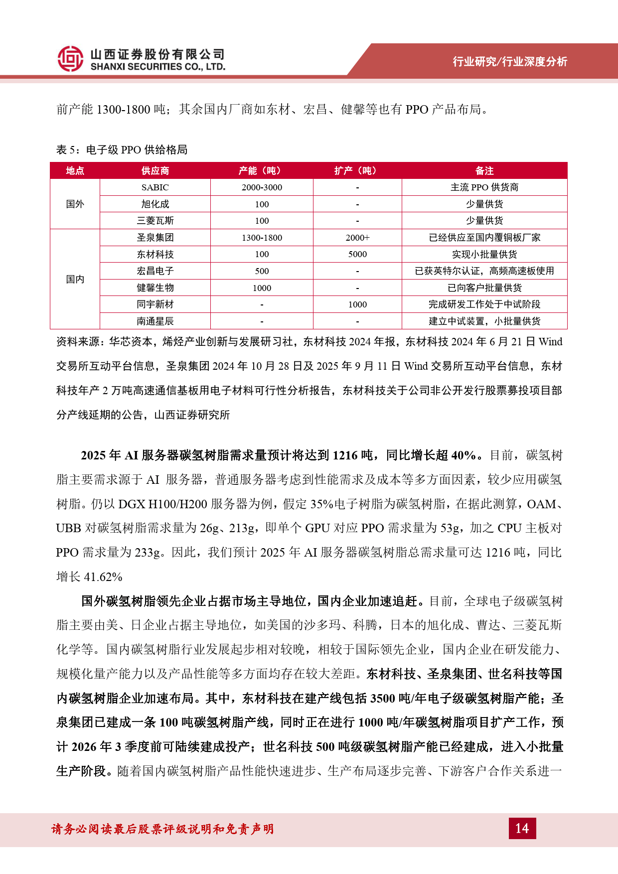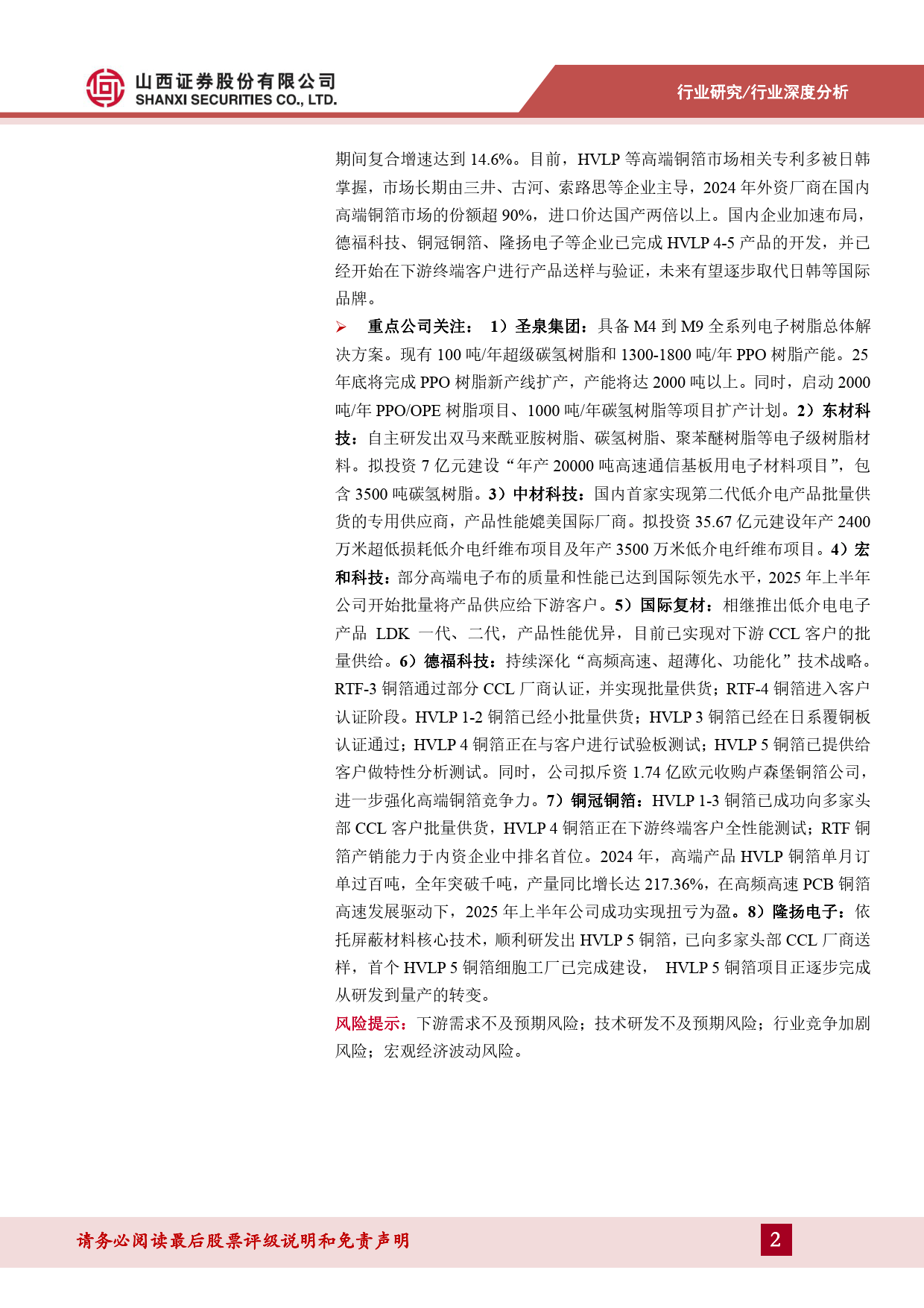 重点企业布局各有侧重。圣泉集团拥有M4-M9全系列电子树脂解决方案,产能持续扩张;东材科技终端客户覆盖主流服务器体系,在建高端电子材料项目;中材科技、宏和科技在Low-DK电子布领域技术领先、产能充足;德福科技、铜冠铜箔、隆扬电子等在HVLP铜箔领域突破显著,部分产品实现批量供货或客户认证。