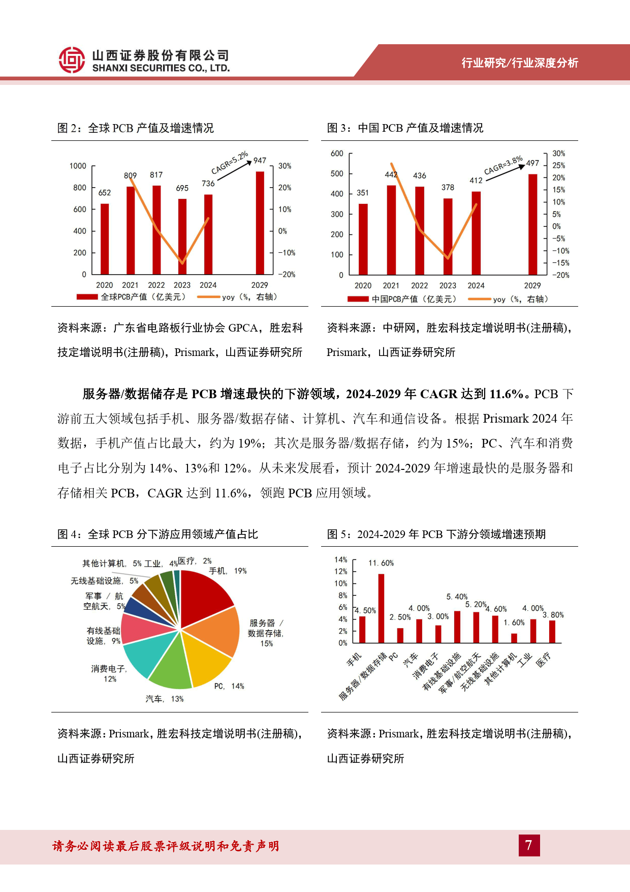 AI服务器需求高增带动PCB高端化需求。全球PCB市场持续增长,预计2029年全球产值将达947亿美元,2024-2029年CAGR为5.2%。国内PCB产值占全球超50%,2029年预计达497.04亿美元。服务器/数据存储是PCB增速最快的下游领域,CAGR达11.6%。PCIe 5.0加速渗透,AI服务器及800G、1.6T交换机放量,推动PCB向更高层数、更低介电常数(Dk)和介质损耗因子(Df)升级,带动上游材料向高频高速发展。