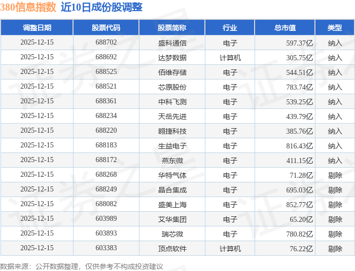 近10日内380信息(000111)指数成份股做了调整,新纳入了9只股票,剔除了6只股票。