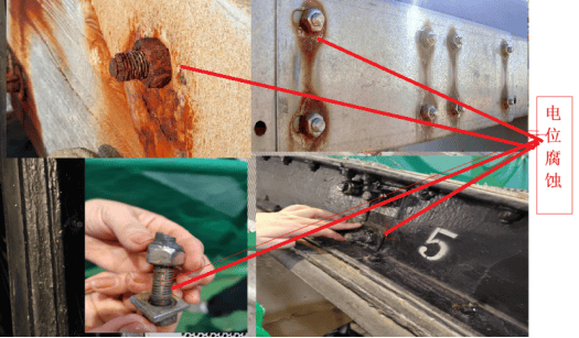 螺栓是连接金属与金属、金属与非金属之间的重要连接配件,在核电、风电、火电、轨道交通、桥梁、车辆、轮船、化工、储油设备设施中有大量连接螺栓,因为其所处的环境极为恶劣,长期浸泡在雨水或海水或干湿交替环境加速腐蚀,这类腐蚀往往是从内部往外腐蚀,虽然很多结构件表面刷重防腐油漆,但防腐涂料只能防止外部往里面腐蚀,但无法阻止内部腐蚀,大部分螺栓腐蚀都是从内部往外腐蚀,主要原因是在水环境或潮气很中的环境中,不同金属之间存在电位差(如碳钢和不锈钢之间的电位差约为0.5V),存在电位差形成“局部电池”,形成电化学反应。在孔穴、垫片接触面、搭接缝内、沉积物下、紧固件缝隙内是常发生缝隙腐蚀、小孔腐蚀,这也是为什么很多结构件,其他地方涂层都是完好,而连接螺栓处从里面往外腐蚀原因,像不锈钢、钛、铝合金等,虽然自身容易形成钝化膜抗腐蚀能力强,但因为存在电位腐蚀,通过螺栓局部小点腐蚀逐步向面腐蚀扩散,点腐蚀导致钝化膜破坏,进而延伸从钝化膜里面进行腐蚀。这种腐蚀无论在结构件表面如何刷涂重防腐涂料,是无法解决的。
