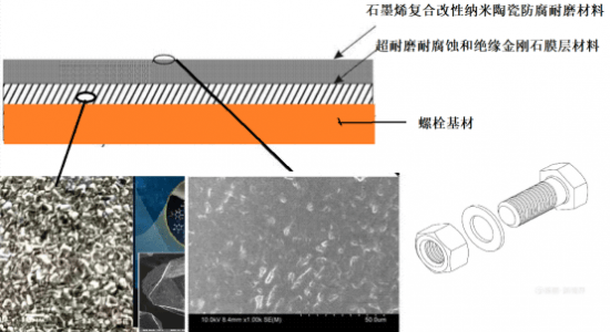 围绕解决螺栓电位腐蚀问题,长纳实验室开发防电位腐蚀螺栓相关复合工艺,通过复合涂层工艺,防止电位腐蚀。具体为超耐磨耐腐蚀和绝缘金属杂化金刚石膜层打底+石墨烯复合改性纳米陶瓷防腐材料封面的多层多元复合方式系统解决电位腐蚀问题。关键技术如下: