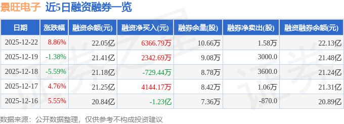 景旺电子融资融券信息显示,融资方面,当日融资买入4.91亿元,融资偿还4.27亿元,融资净买入6366.79万元。融券方面,融券卖出1.66万股,融券偿还800.0股,融券余量10.66万股,融券余额776.79万元。融资融券余额22.13亿元。