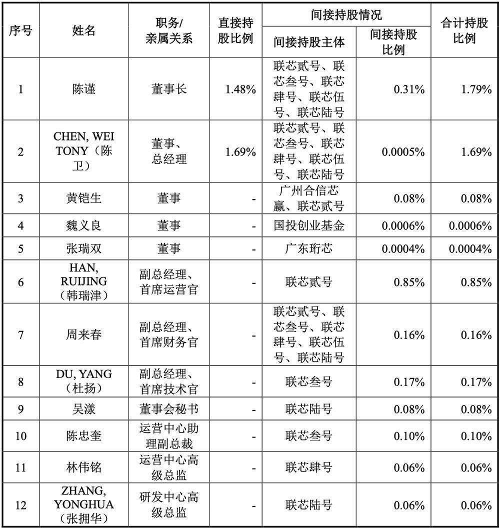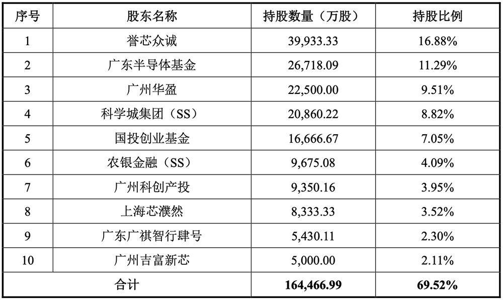 报告期内,其股权结构较为分散,持股5%以上的股东包括誉芯众诚、广东半导体基金、广州华盈、科学城集团、国投创业基金,持股比例分别为16.88%、11.29%、9.51%、8.82%、7.05%。
