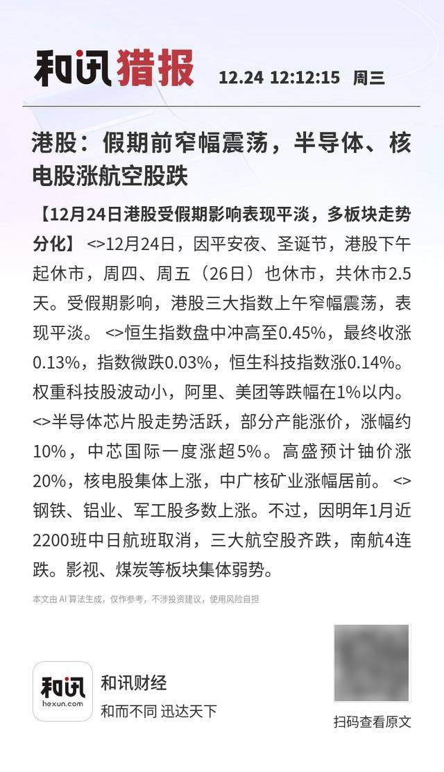 【12月24日港股受假期影响表现平淡,多板块走势分化】12月24日,因平安夜、圣诞节,港股下午起休市,周四、周五(26日)也休市,共休市2.5天。受假期影响,港股三大指数上午窄幅震荡,表现平淡。恒生指数盘中冲高至0.45%,最终收涨0.13%,指数微跌0.03%,恒生科技指数涨0.14%。权重科技股波动小,阿里、美团等跌幅在1%以内。半导体芯片股走势活跃,部分产能涨价,涨幅约10%,中芯国际一度涨超5%。高盛预计铀价涨20%,核电股集体上涨,中广核矿业涨幅居前。钢铁、铝业、军工股多数上涨。不过,因明年1月近2200班中日航班取消,三大航空股齐跌,南航4连跌。影视、煤炭等板块集体弱势。