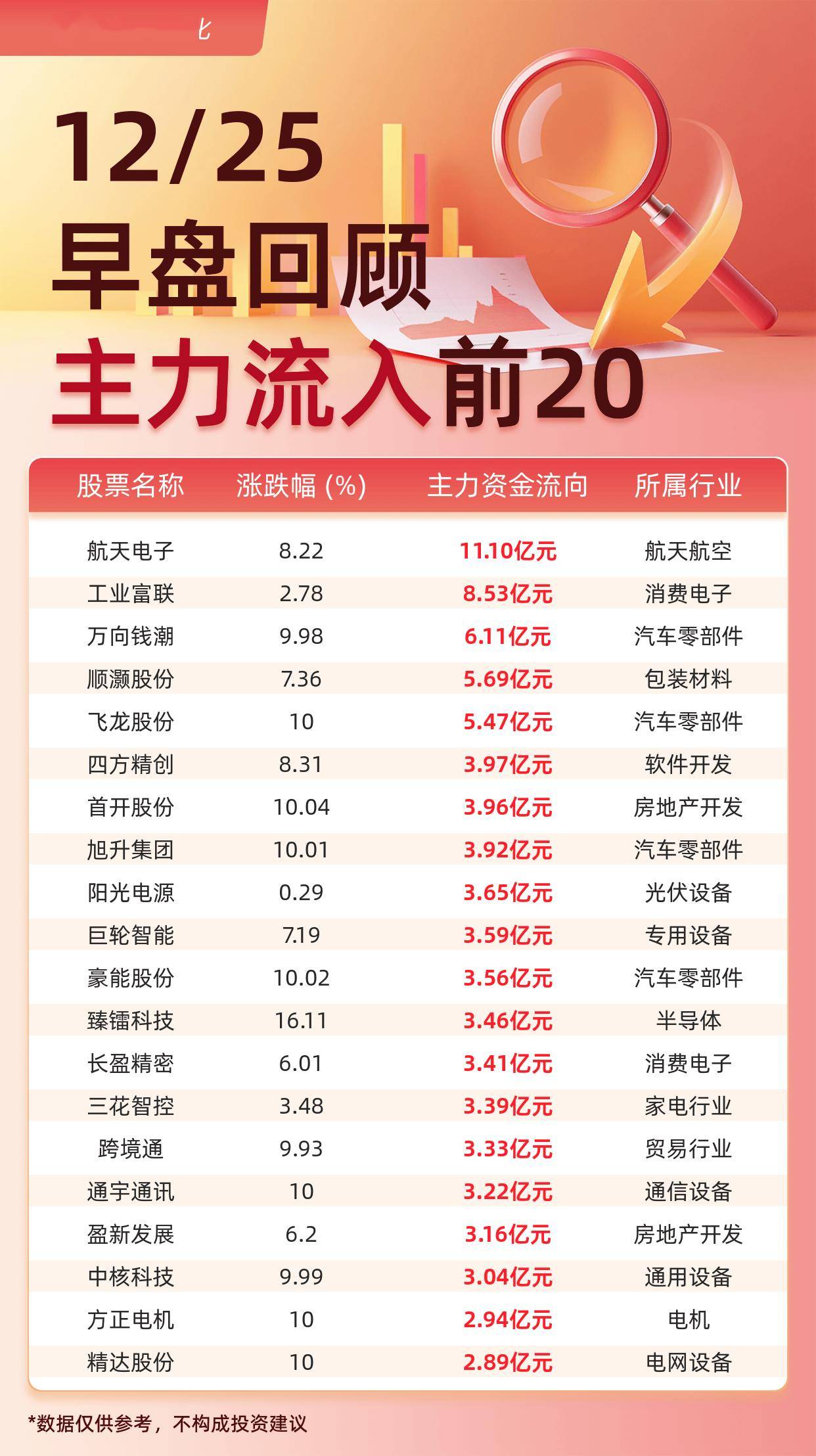 据交易所数据显示,截至12月25日午间收盘,主力资金流入前20的股票分别为: 航天电子(11.10亿元)、 工业富联(8.53亿元)、 万向钱潮(6.11亿元)、 顺灏股份(5.69亿元)、 飞龙股份(5.47亿元)、 四方精创(3.97亿元)、 首开股份(3.96亿元)、 旭升集团(3.92亿元)、 阳光电源(3.65亿元)、 巨轮智能(3.59亿元)、 豪能股份(3.56亿元)、 臻镭科技(3.46亿元)、 长盈精密(3.41亿元)、 三花智控(3.39亿元)、 跨境通(3.33亿元)、 通宇通讯(3.22亿元)、 盈新发展(3.16亿元)、 中核科技(3.04亿元)、 方正电机(2.94亿元)、 精达股份(2.89亿元)。