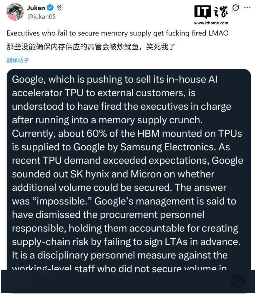 IT之家援引博文介绍,供应链的紧张局势在谷歌内部引发了更严厉的人事变动。由于未能预见市场紧缩并提前签署长期协议(LTA),导致公司面临 HBM 供应不足的风险,谷歌据报已解雇了一名相关采购高管。