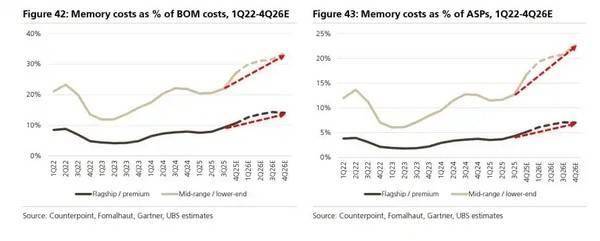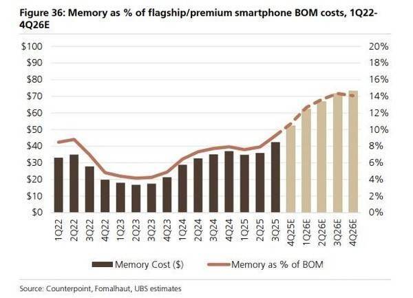 瑞银报告指出,到2026年第四季度,内存成本在旗舰/高端手机BOM(物料清单)中的占比将达到约14%,高于2025年第四季度的11%和2024年第四季度的8%。届时,单台旗舰机的内存成本价值将从2025年第四季度的52美元跃升至73美元,同比增幅高达41%。