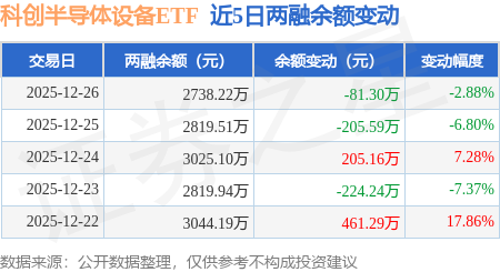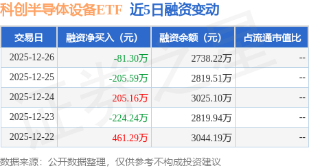 证券之星消息,12月26日,科创半导体设备ETF(588710)融资买入514.3万元,融资偿还595.59万元,融资净卖出81.3万元,融资余额2738.22万元。