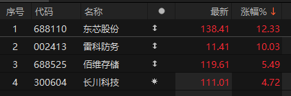 12月30日早盘,存储芯片概念走强。9时50分,东芯股份涨超12%,雷科防务涨停,佰维存储、长川科技等跟涨。