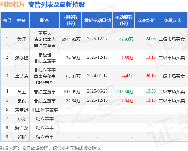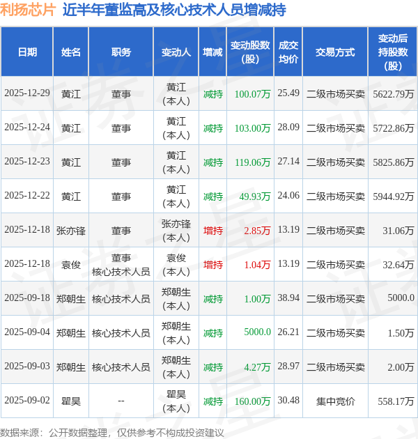 利扬芯片近半年内的董监高及核心技术人员增减持详情如下: