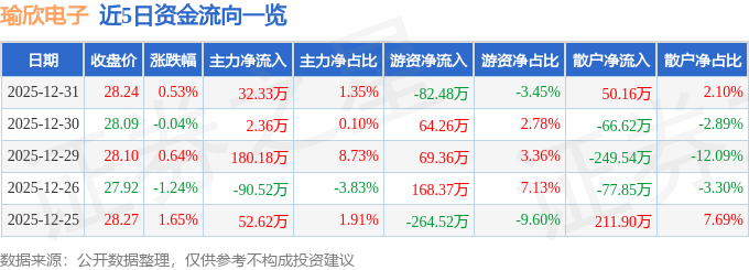 证券之星消息,截至2025年12月31日收盘,瑜欣电子(301107)报收于28.24元,上涨0.53%,换手率1.43%,成交量8500.0手,成交额2390.26万元。