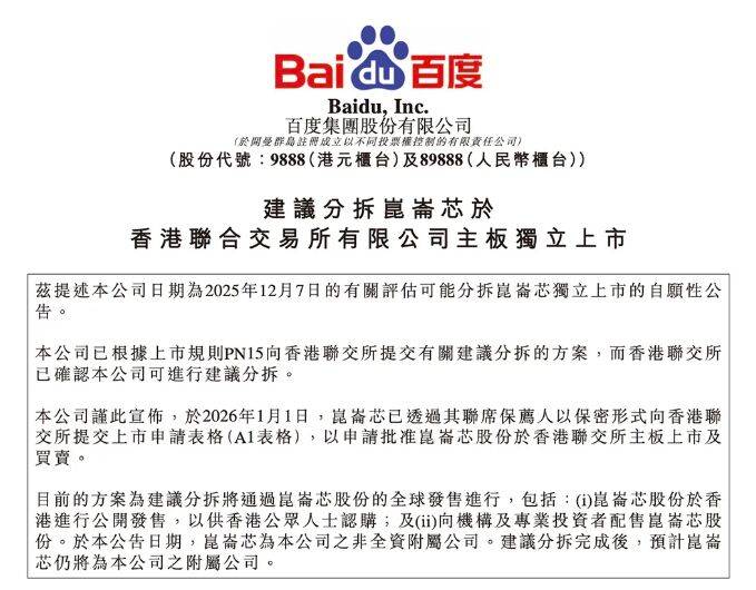 今日,百度集团发布公告,宣布其旗下AI芯片公司昆仑芯已于1月1日以保密形式向港交所提交上市申请表格(A1表格),以申请批准昆仑芯股份在港交所主板上市及买卖。