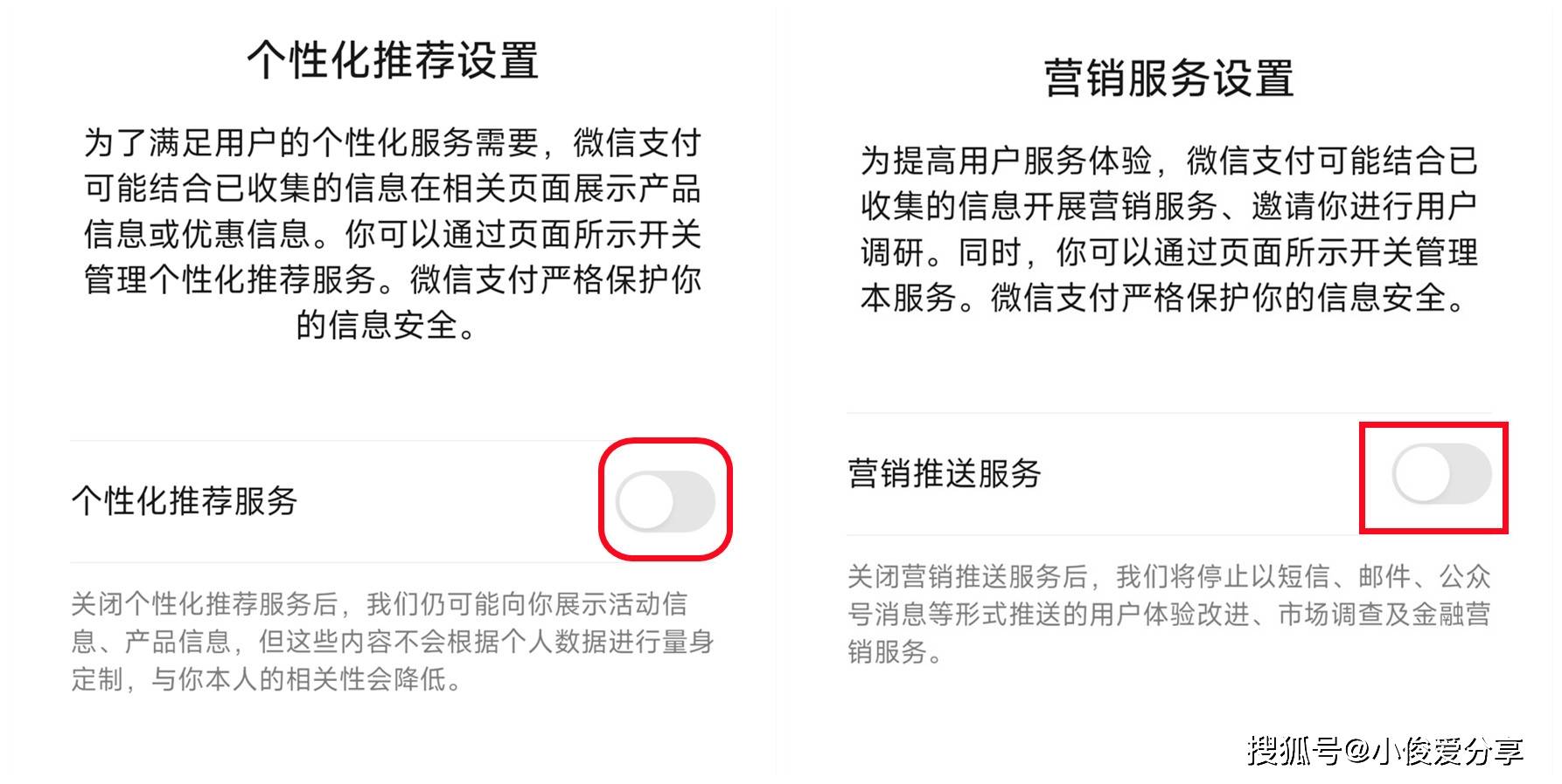 除了对以上这4个地方进行关闭和设置之外,咱们还可以在微信消费者保护中,把营销推送和个性化推荐服务这两个开关也关掉,这样也可以有效保护我们的个人信息!