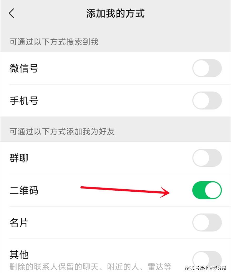 我们只保留一个二维码添加方式就可以了,为什么呢?因为这样别人就只能和我们面对面扫码添加,或者我们发送二维码给她,她才能添加我们,你想一下,既然能通过二维码添加我们,那肯定都是我们熟悉的人了,对不对!