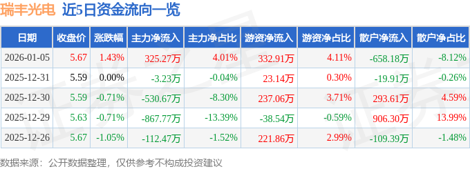 证券之星消息,截至2026年1月5日收盘,瑞丰光电(300241)报收于5.67元,上涨1.43%,换手率2.45%,成交量14.36万手,成交额8104.76万元。