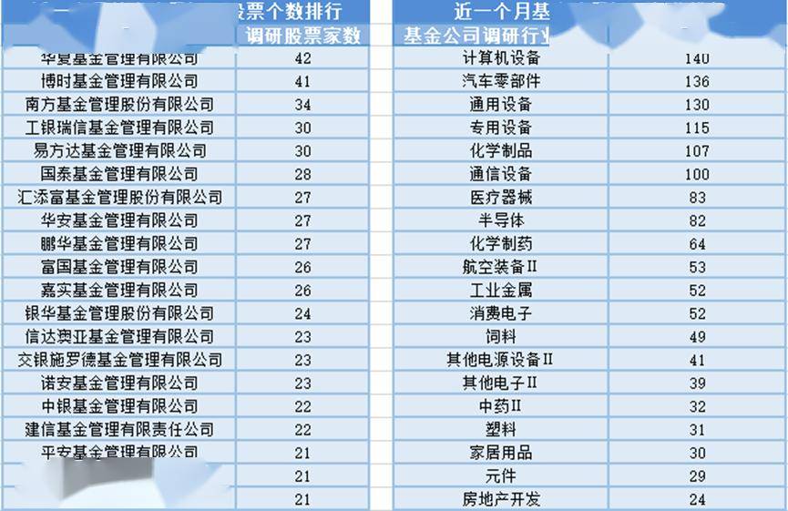 近一个月(12月8日-1月7日),华夏基金参与公司调研的数量最多,共调研42家上市公司,此外调研较为活跃的还有博时基金、南方基金和工银瑞信基金,分别调研41家、34家、30家上市公司;从调研行业上来看,基金公司对计算机设备行业的上市公司调研次数最多,共有140次,其次是汽车零部件行业,基金公司调研了136次。