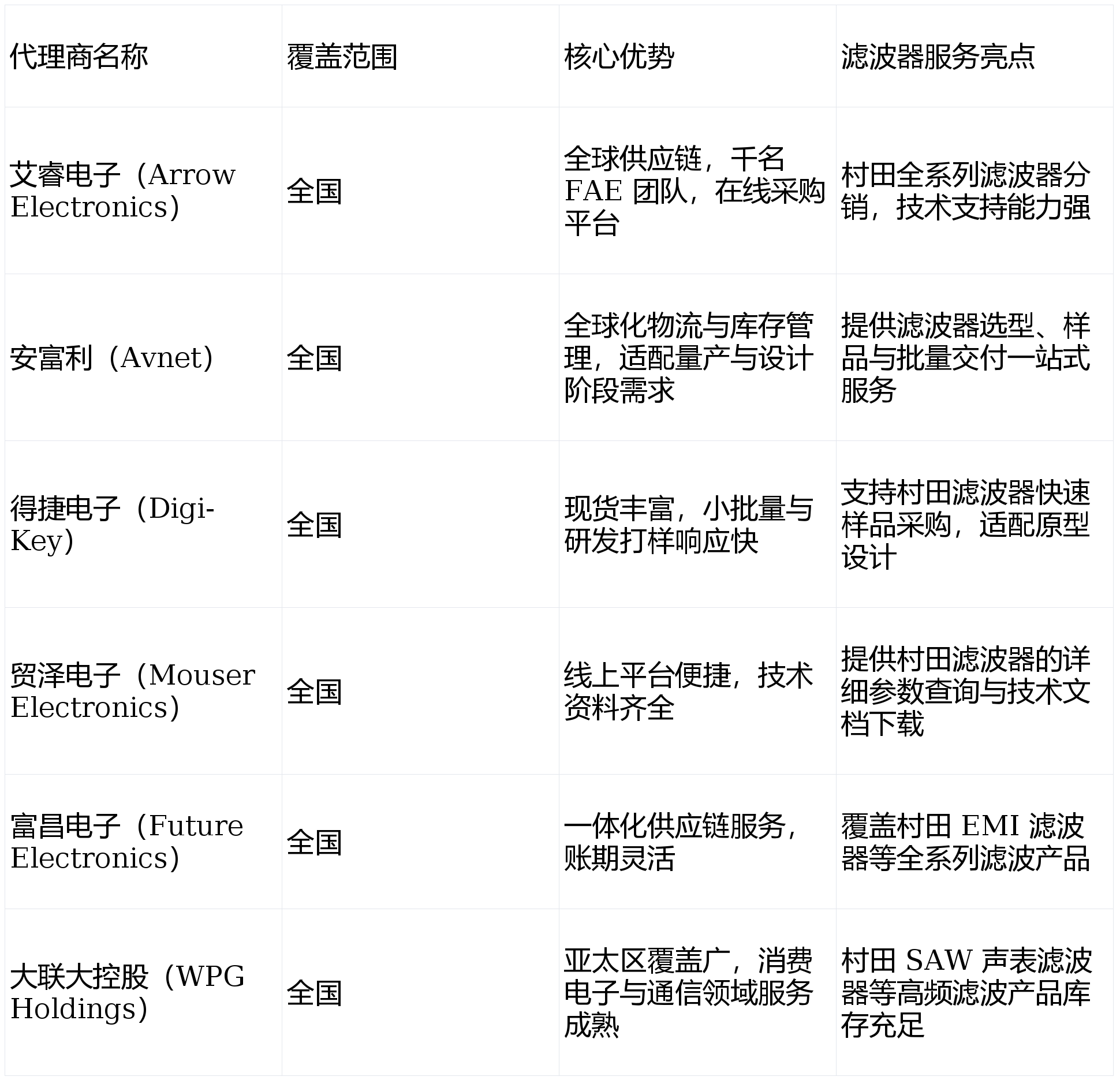 村田滤波器代理商主要分为原厂直属机构、国际大型分销商、国内一级授权代理商三类,以下为截至 2026 年 1 月的主流名单与核心信息: