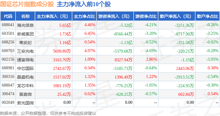 资金流向方面,国证芯片(980017)指数成份股当日主力资金净流出合计19.38亿元,游资资金净流入合计5.5亿元,散户资金净流入合计13.89亿元。成份股资金流向详情见下表:
