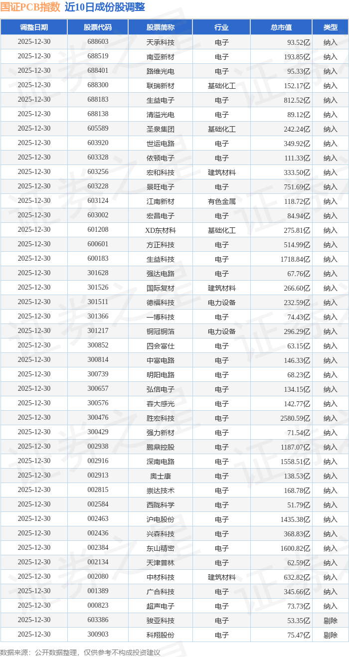近10日内国证PCB(980115)指数成份股做了调整,新纳入了40只股票,剔除了2只股票。