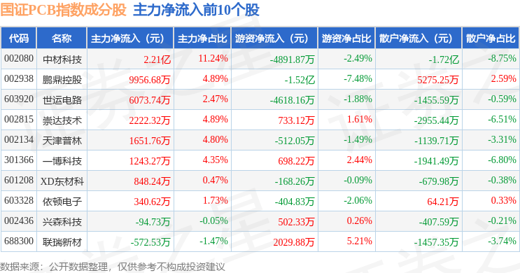 资金流向方面,国证PCB(980115)指数成份股当日主力资金净流出合计51.17亿元,游资资金净流入合计15.11亿元,散户资金净流入合计36.06亿元。成份股资金流向详情见下表: