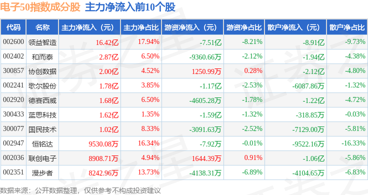 资金流向方面,电子50(399281)指数成份股当日主力资金净流出合计15.4亿元,游资资金净流入合计1.15亿元,散户资金净流入合计14.26亿元。成份股资金流向详情见下表: