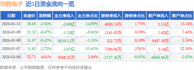证券之星消息,截至2026年1月12日收盘,均胜电子(600699)报收于30.6元,下跌2.92%,换手率6.44%,成交量87.28万手,成交额26.74亿元。