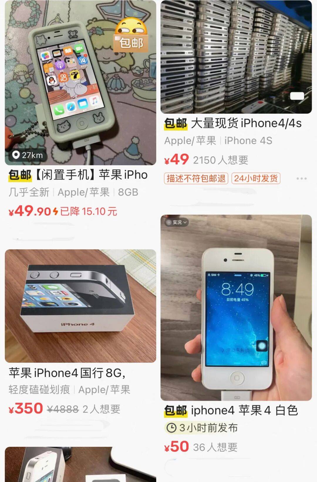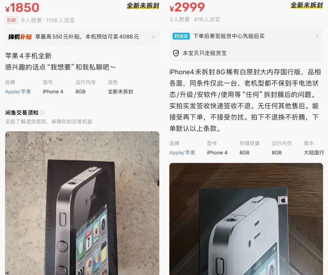 二手平台上,大量卖家挂出iPhone4售卖链接,标价从几十元到几百元不等,商品描述清一色标注“收藏首选”“复古爱好者必备”。