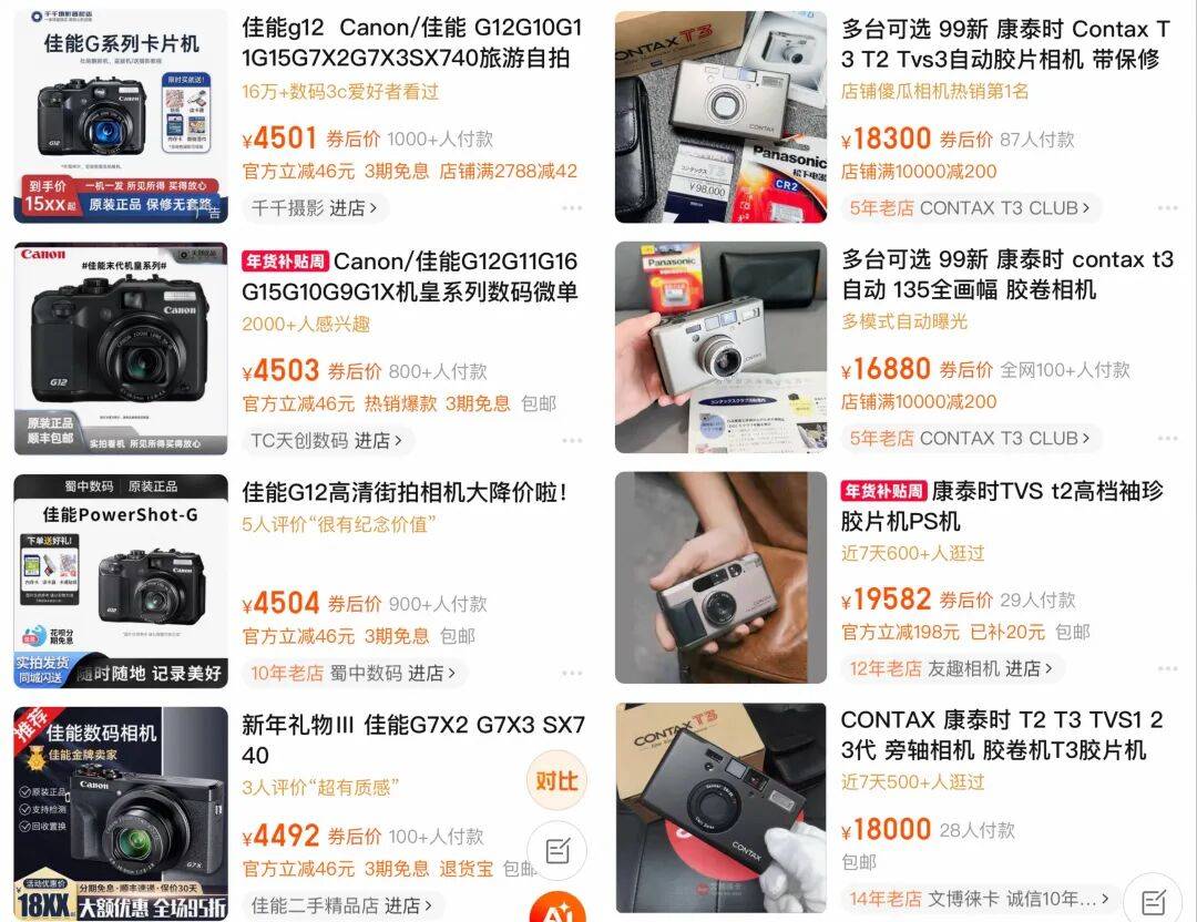 曾经被当作电子废品按斤卖的CCD相机,如今身价倍增,二手价稳定在400-1000元,热门佳能机型G12,胶片相机contax t3等更是从几千到上万元不等且供不应求。