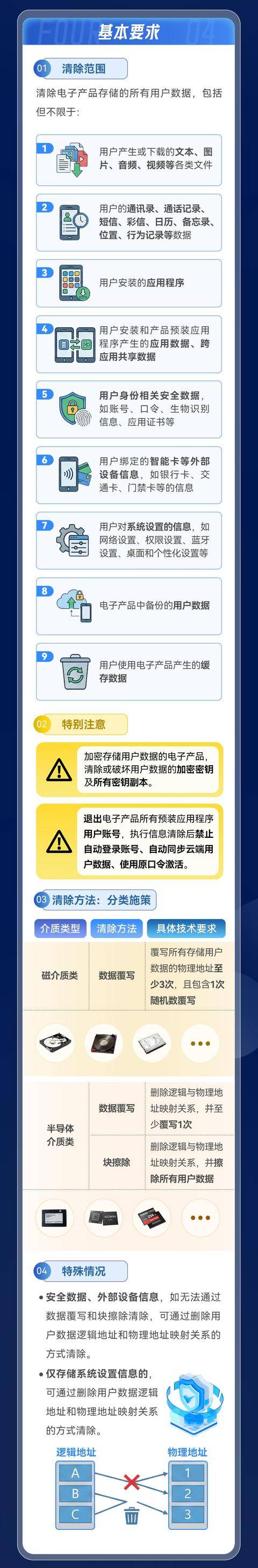 对于电子产品生产厂商,标准提出了源头治理的要求。厂商应为用户提供内置的信息清除功能。如无法开发内置功能,厂商也必须提供外部专用清除工具、可靠的第三方清除工具信息或免费的专业清除服务。操作前需明确告知用户清除范围及影响,并征得用户同意。