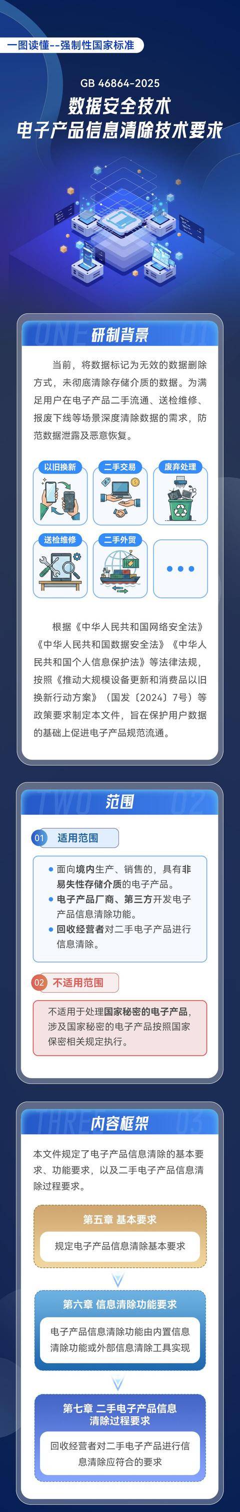 这项强制性国家标准的适用范围涵盖了在我国境内生产、销售的各类具有非易失性存储介质的电子产品,包括手机、平板电脑、笔记本电脑、台式计算机,以及智能穿戴设备、办公设备等。其约束对象既包括电子产品制造商、技术服务提供方,也包括二手电子产品回收经营者。