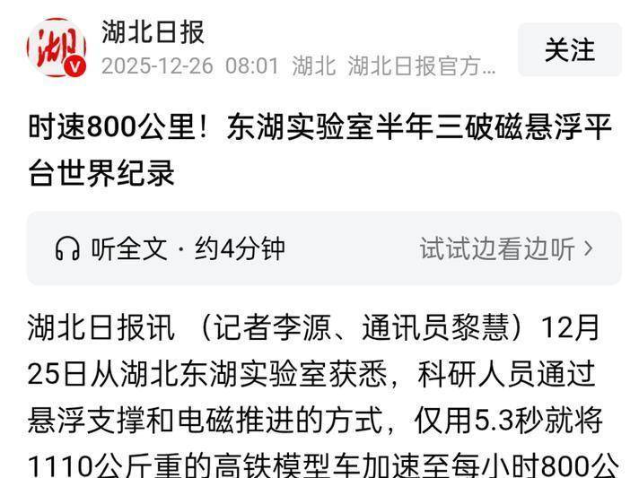 时间仅仅过去不到24小时,2025年12月26日,来自湖北武汉的新闻再次引爆网络。 东湖实验室正式宣布,他们取得了更进一步的突破。 在实验室的测试线上,科研人员采用“永磁电动悬浮导向加电磁推进”的技术方案,将一个重达1110公斤的高铁模型车,在5.3秒内加速到了每小时800公里。 这条测试线的长度,只有一公里。 这意味着,车辆在极短的距离内就达到了极速,甚至在300米处的观测点,人们用肉眼已经无法清晰捕捉车辆的轨迹,只能看到一道黑影一闪而过,即使用专业的高速相机拍摄,画面中也只剩下模糊的残影。 东湖实验室的这次破纪录,并非一蹴而就,而是一个清晰的、步步为营的“闯关”过程。 就在2025年6月16日,他们首次进行公开演示,将1030公斤的试验车推到了650公里每小时,创造了当时的纪录。 一个月后的7月14日,他们把这个数字提升到了700公里每小时。 到了11月24日,关键的突破来临,他们成功冲刺到了800公里每小时。 在随后的一个月里,团队没有停下,继续验证了在800公里时速下的速度控制精度、高速悬浮稳定性等一系列关乎未来实际应用的关键指标。 半年时间,三次打破世界纪录,这种迭代升级的速度,本身就是一个奇迹。