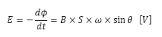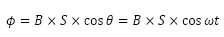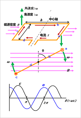 此时,假设线圈表面的平行方向(中间图中的黄线)和相对于磁通密度方向的垂直线(黑色虚线)形成角度为θ(=ωt),则穿透线圈的磁通量Φ由下式表示: