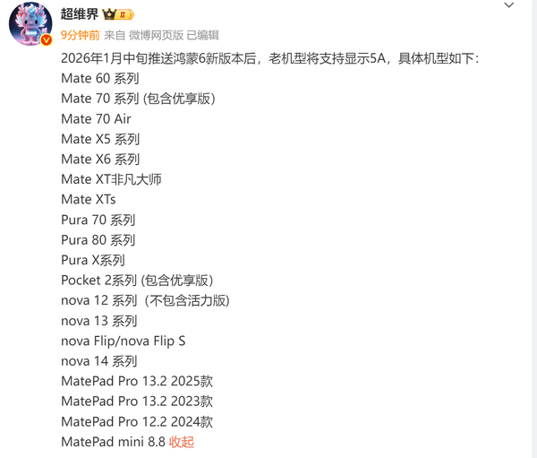 【CNMO科技消息】近日,有数码博主发文透露,在升级至2026年1月中旬推送的鸿蒙6新版本后,部分老机型将支持显示5A网络。