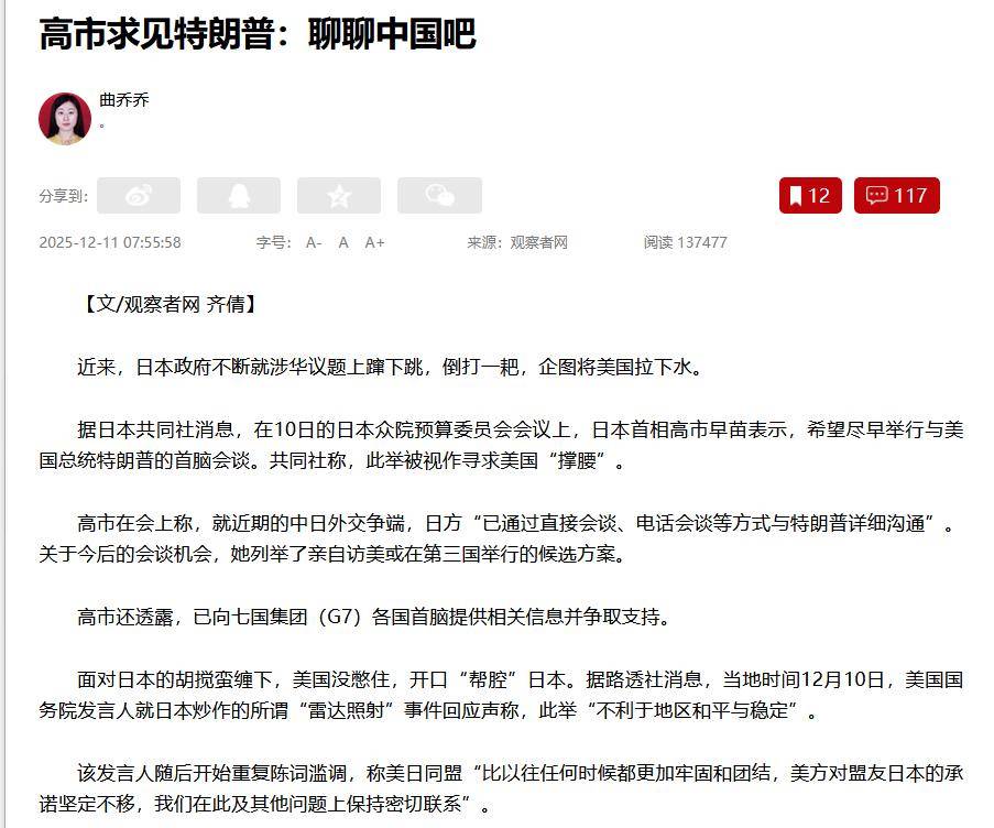 可以看出,高市早苗此刻急得不得了,甚至日本共同社也报道称,高市正在寻求美国的支援。在这种背景下,美国自然不能无动于衷,迅速表态称美日同盟比任何时候都更加紧密,并表示雷达照射问题不利于地区稳定,强调双方团结。换句话说,尽管美国口头上支持日本,但是否会采取实质行动支持日本却依然充满疑问。毕竟,日本现在是在进行军事冒险,而美国对此非常敏感。特朗普的核心理念一直是赚钱,如果局势失控,如何继续赚钱呢?所以,美国的支持更可能只是停留在口头上。