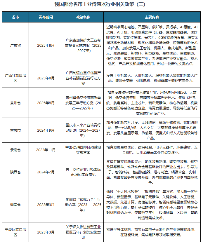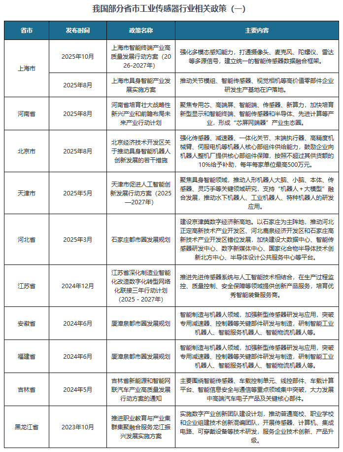 我国各省市也积极响应国家政策规划,对各省市工业传感器行业的发展做出了具体规划,支持当地工业传感器行业稳定发展,比如上海市发布的《上海市智能终端产业高质量发展行动方案(2026-2027年)》、河南省发布的《河南省培育壮大战略性新兴产业和前瞻布局未来产业行动计划》。