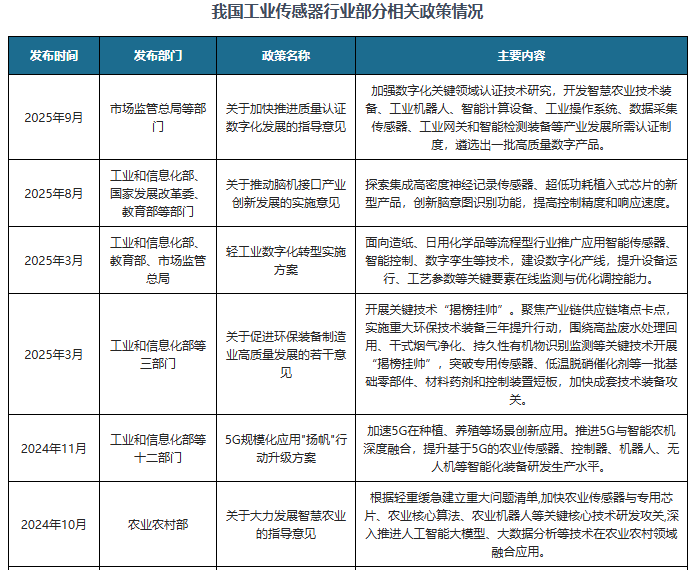 为了进一步推动工业传感器行业的发展,我国陆续发布了多项政策,如2025年9月市场监管总局等部门发布《关于加快推进质量认证数字化发展的指导意见》加强数字化关键领域认证技术研究,开发智慧农业技术装备、工业机器人、智能计算设备、工业操作系统、数据采集传感器、工业网关和智能检测装备等产业发展所需认证制度,遴选出一批高质量数字产品。