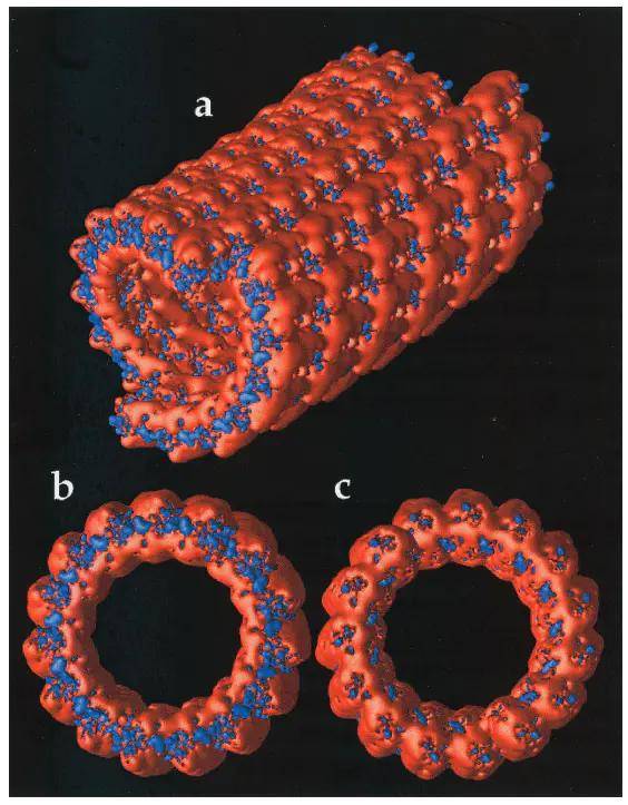 微管内腔的红色区域呈现正电势,源于α微管蛋白内部的精氨酸残基,可排斥胞质中的阳离子(如Na⁺、K⁺),维持管腔内部的低离子浓度,为微管的结构稳定性提供环境支撑;纵向条纹的交替分布与微管蛋白异二聚体的排列周期一致,这种周期性电势场与驱动蛋白的步进机制相匹配,通过静电势能的周期性变化为驱动蛋白的定向运动提供能量梯度,确保其沿微管长轴单向移动而不反向滑动。