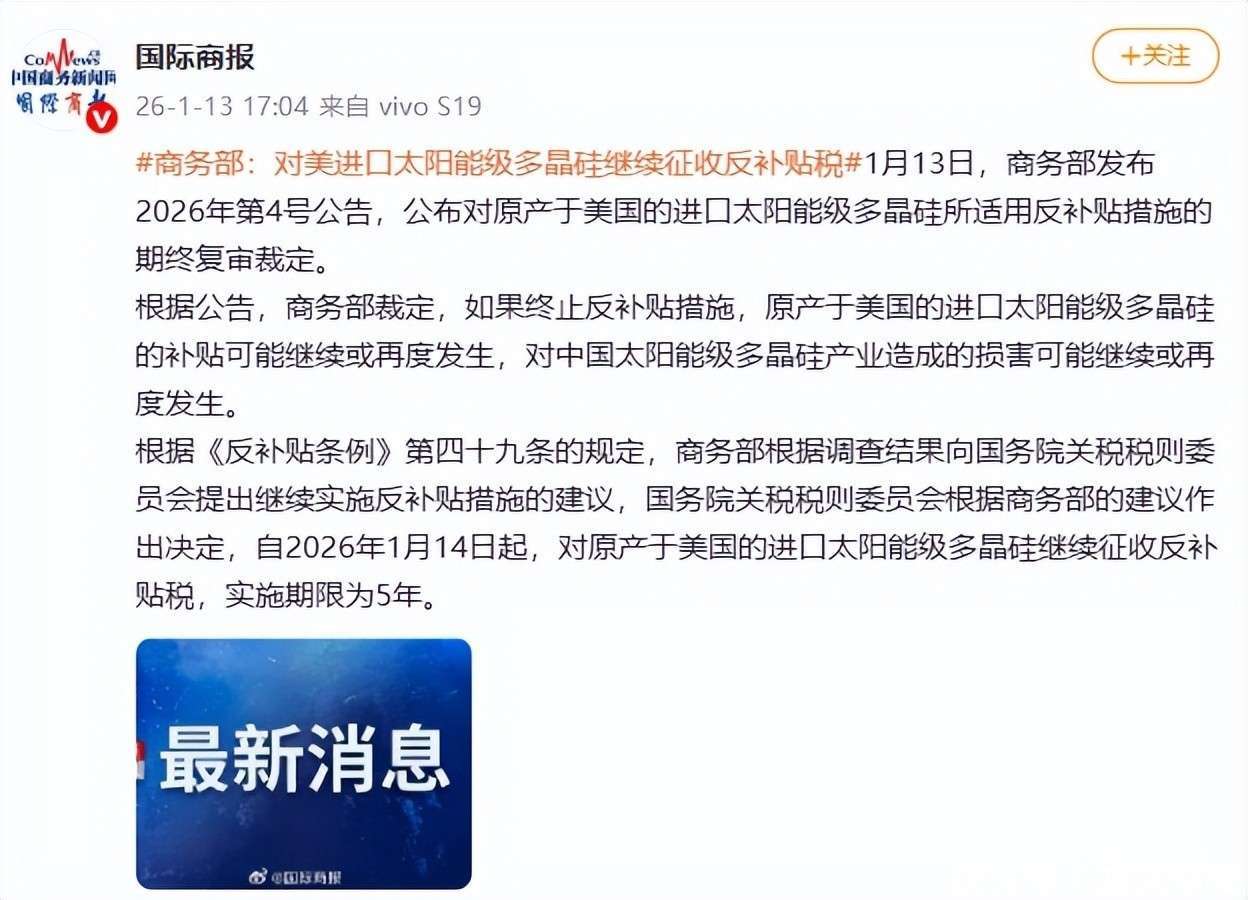 在美方频繁出招之时,中国并没有急于反应,而是选择了等待时机。1月13日,中国商务部发布公告,继续对来自美国和韩国的多晶硅产品征收反倾销税,执行期长达五年。这项看似延续性的政策,其实是中国早已准备好的战略性反击。